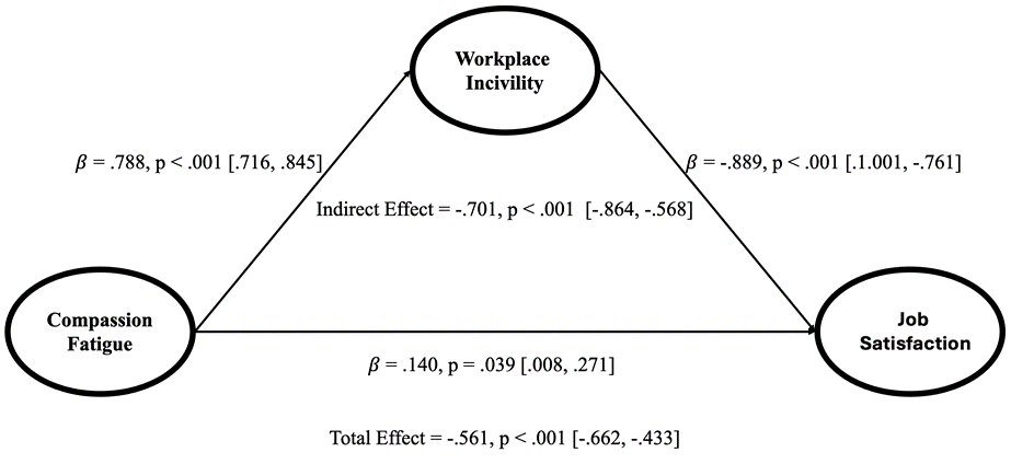 Results: Results showed that compassion fatigue significantly predicted workplace incivility, which was strongly and negatively associated with job satisfaction. Moreover, workplace incivility significantly mediated the relationship between compassion fatigue and job satisfaction. These findings suggest that emotional exhaustion contributes not only to behavioral disruptions in the workplace but also to attitudinal decline.